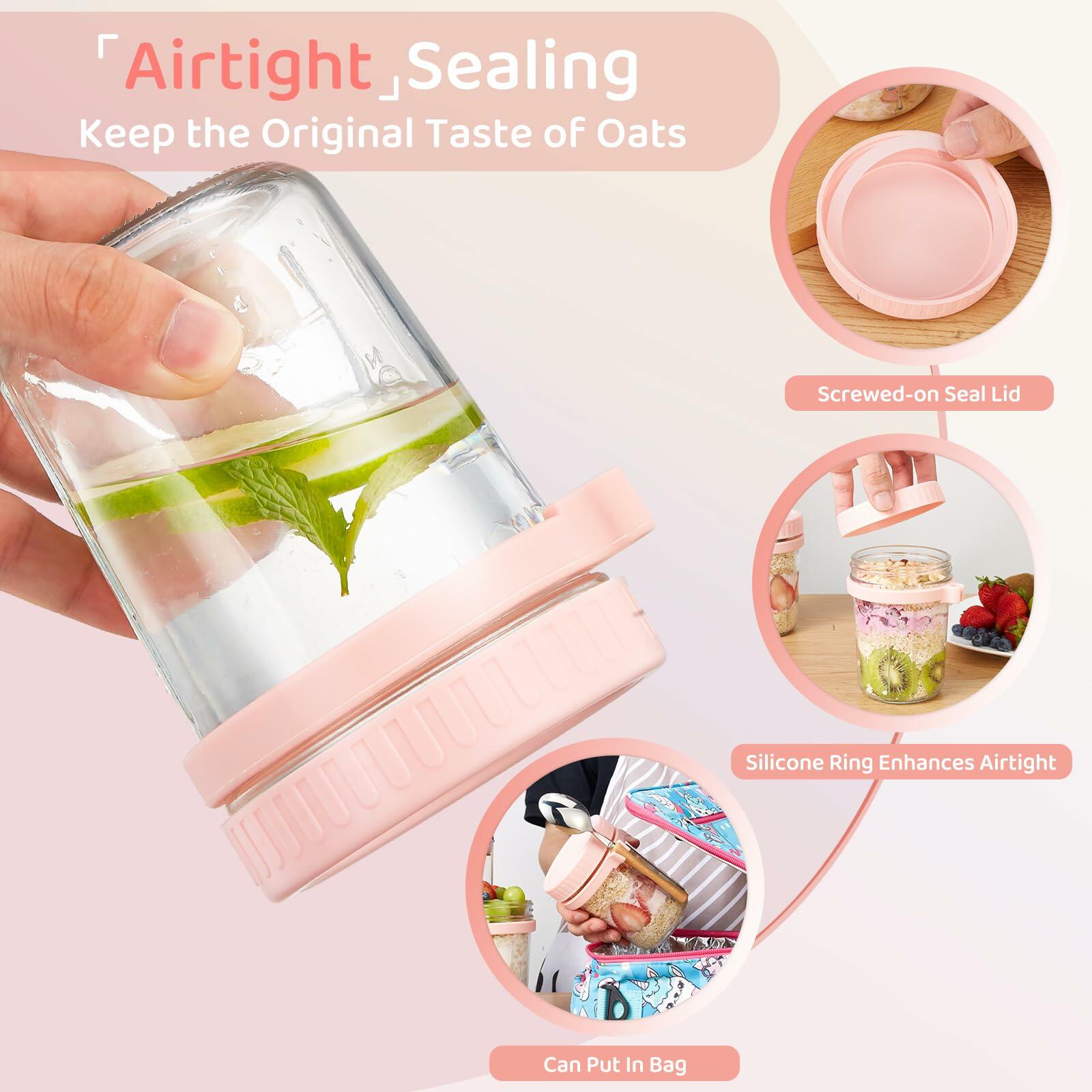 These glass containers are ideal for preparing overnight oats, yogurt, pudding, salads, and other meals. The set includes four 16oz jars with two in pink and two in white, along with two stainless steel spoons.