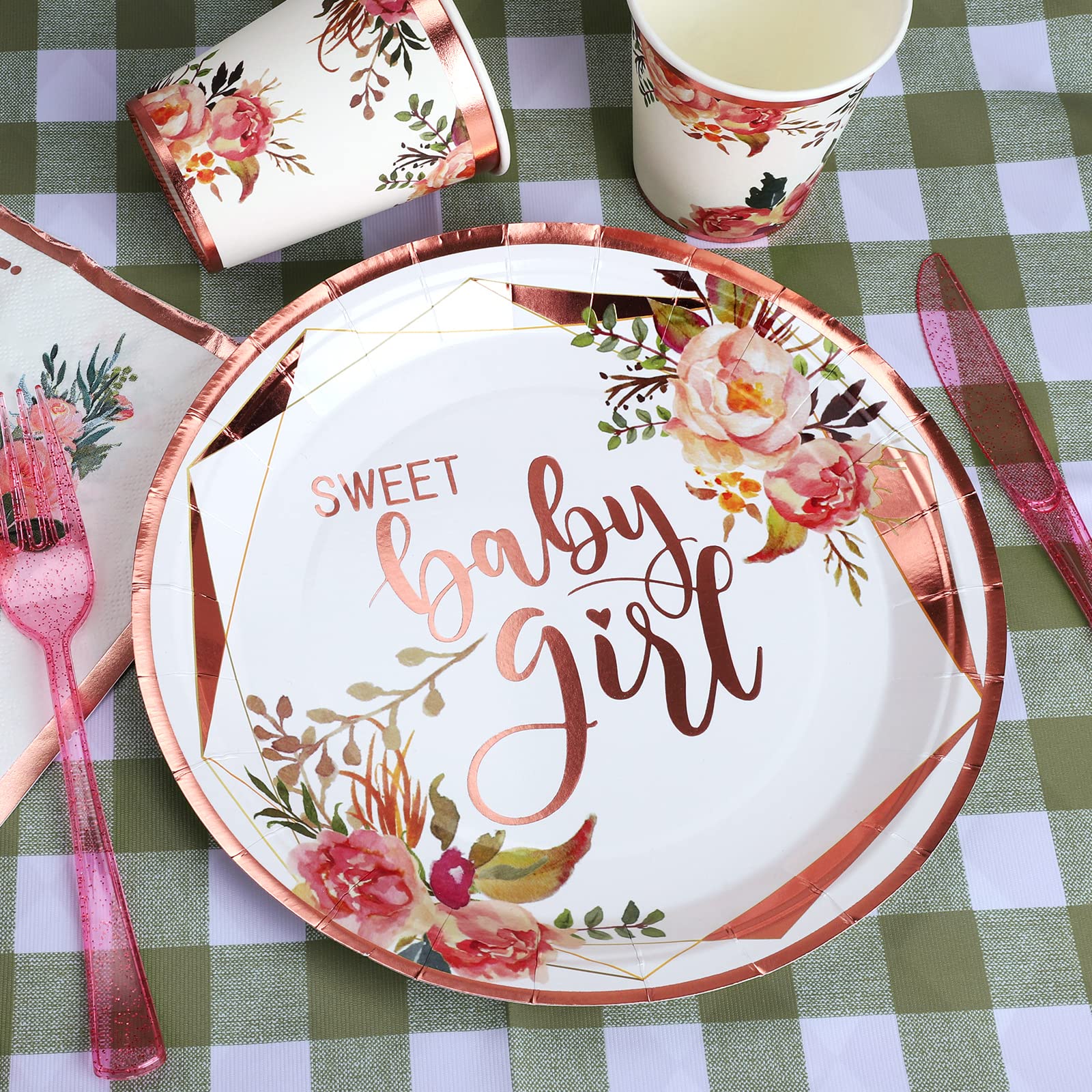 The rose gold and floral design creates a charming atmosphere for your baby girl celebration. Dinner plates feature a stylish "baby girl" bronzing process, complementing the overall theme.