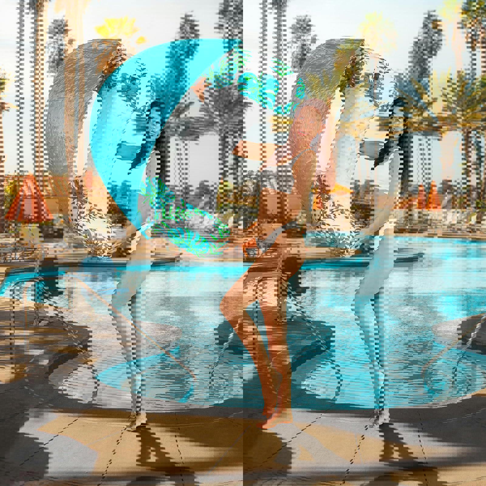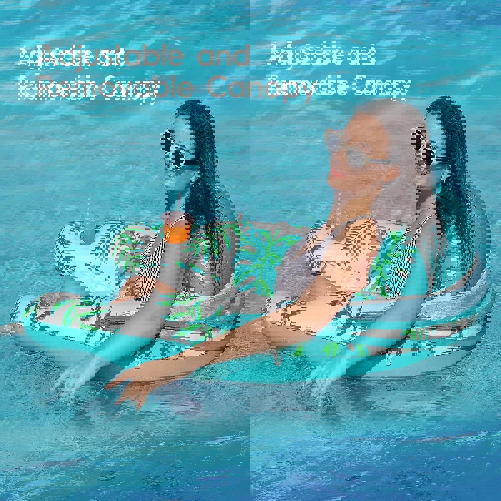 Relax in comfort with our spacious inflatable pool float featuring an adjustable and removable canopy. This lounger is designed for ultimate relaxation in the pool or on the water.