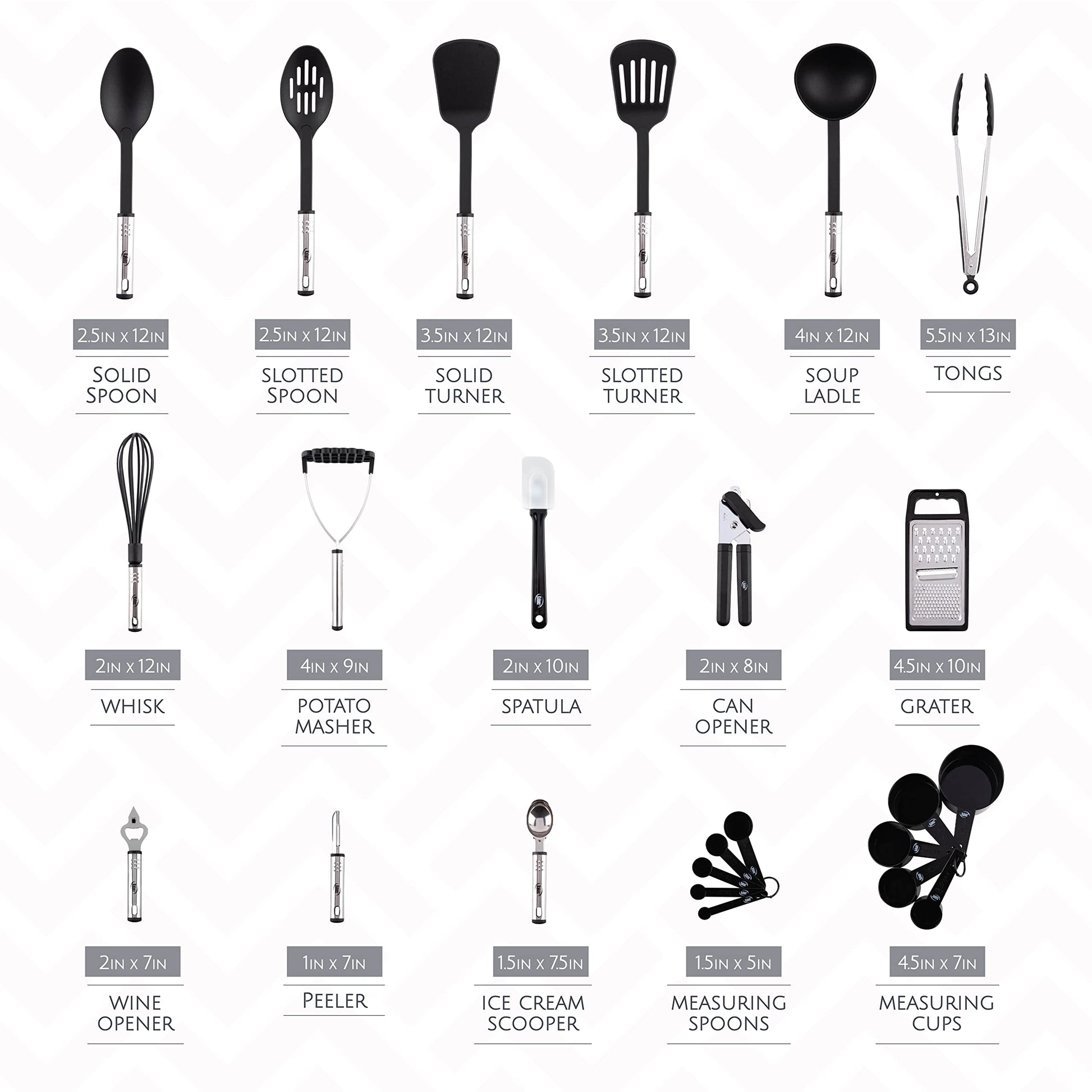 This versatile set is designed to assist with various food preparation tasks, including whisking, peeling, cutting, stirring, mixing, basting, baking, grilling, frying, and serving.