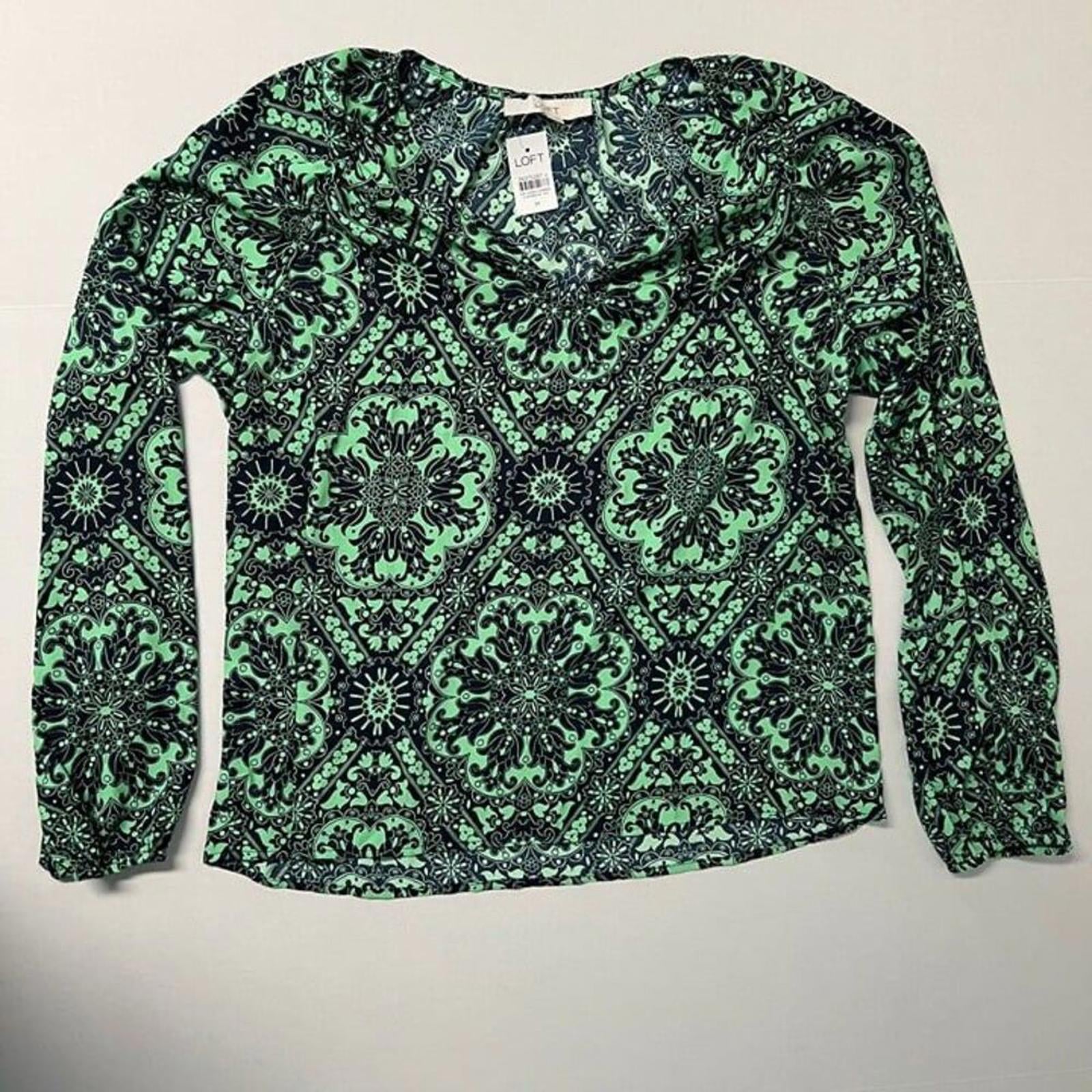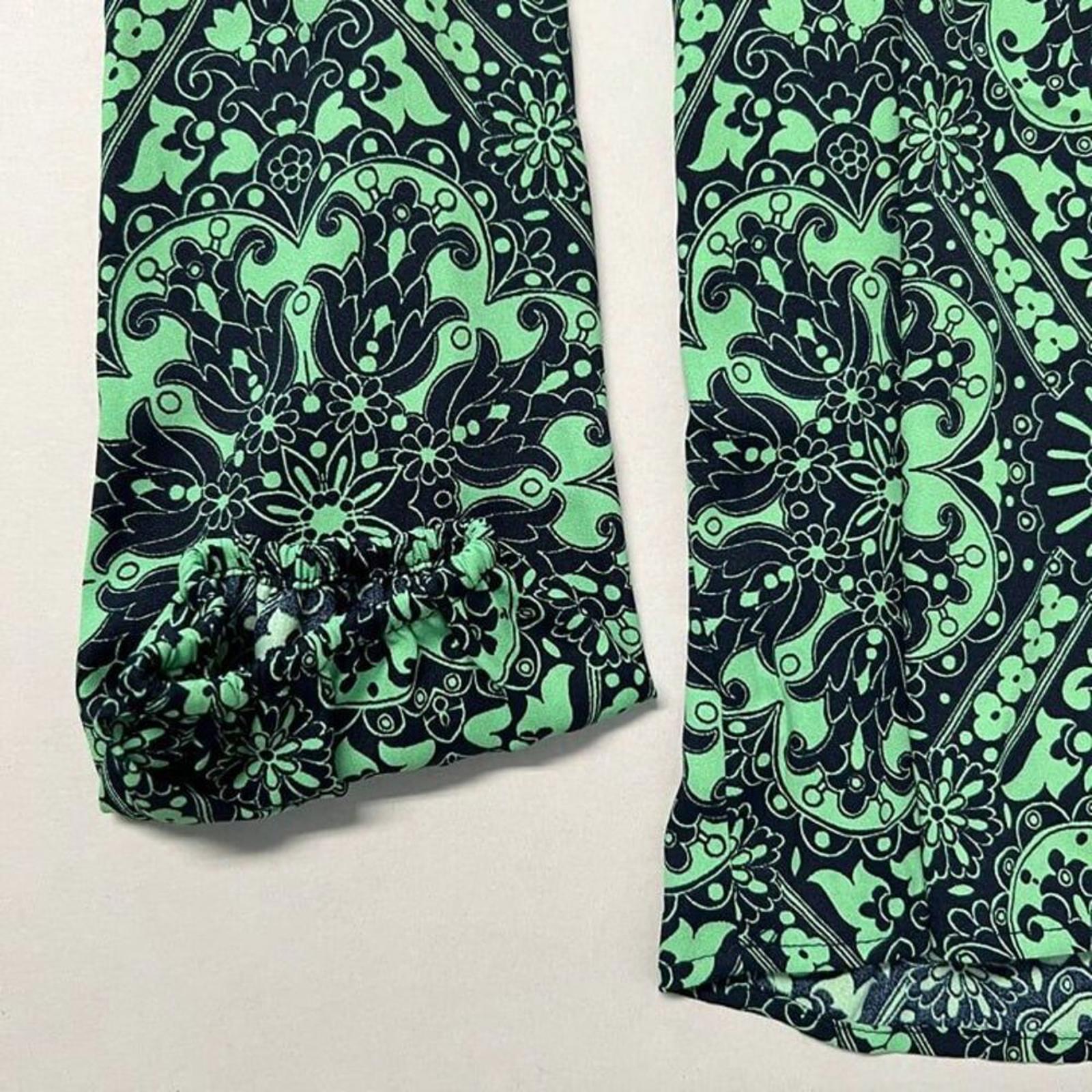 Drapey raglan V-neck top, elastic cuffs, machine washable. Hits below natural waist. Color: Green / Navy Blue These measurements are approximate and taken with the item lying flat. Pit to pit: 20" Total length: 24" Size: Medium