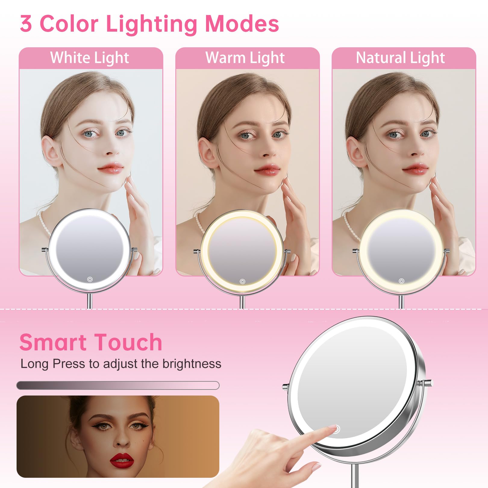 This makeup mirror features three light color options: White, Warm, and Natural. Easily switch between light modes with a quick touch to see how your makeup appears in various lighting situations, simulating daytime, evening, and work environments.