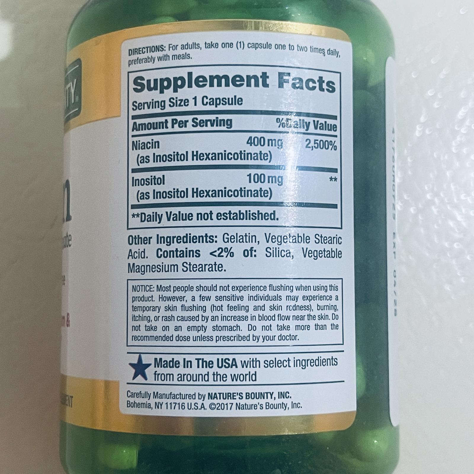 Supplement Facts: Serving Size 1 Capsule, Niacin 400mg, Inositol 100mg.