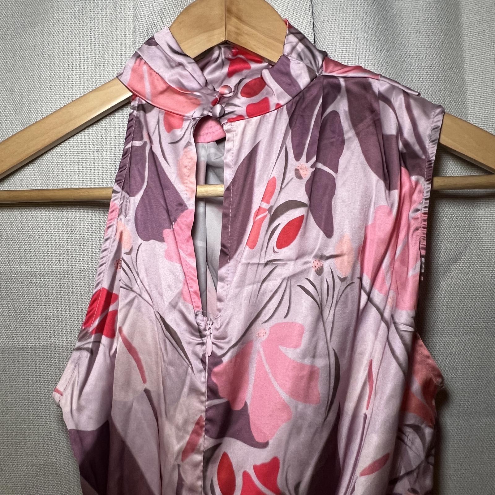 This satin maxi dress blends classic elegance with modern details. Its statuesque silhouette features a sophisticated mock neck adorned with soft pleats and a unique single cutaway shoulder. A charming floral print adds contemporary appeal. Secured with a hidden back zip and a keyhole button closure for a seamless look.