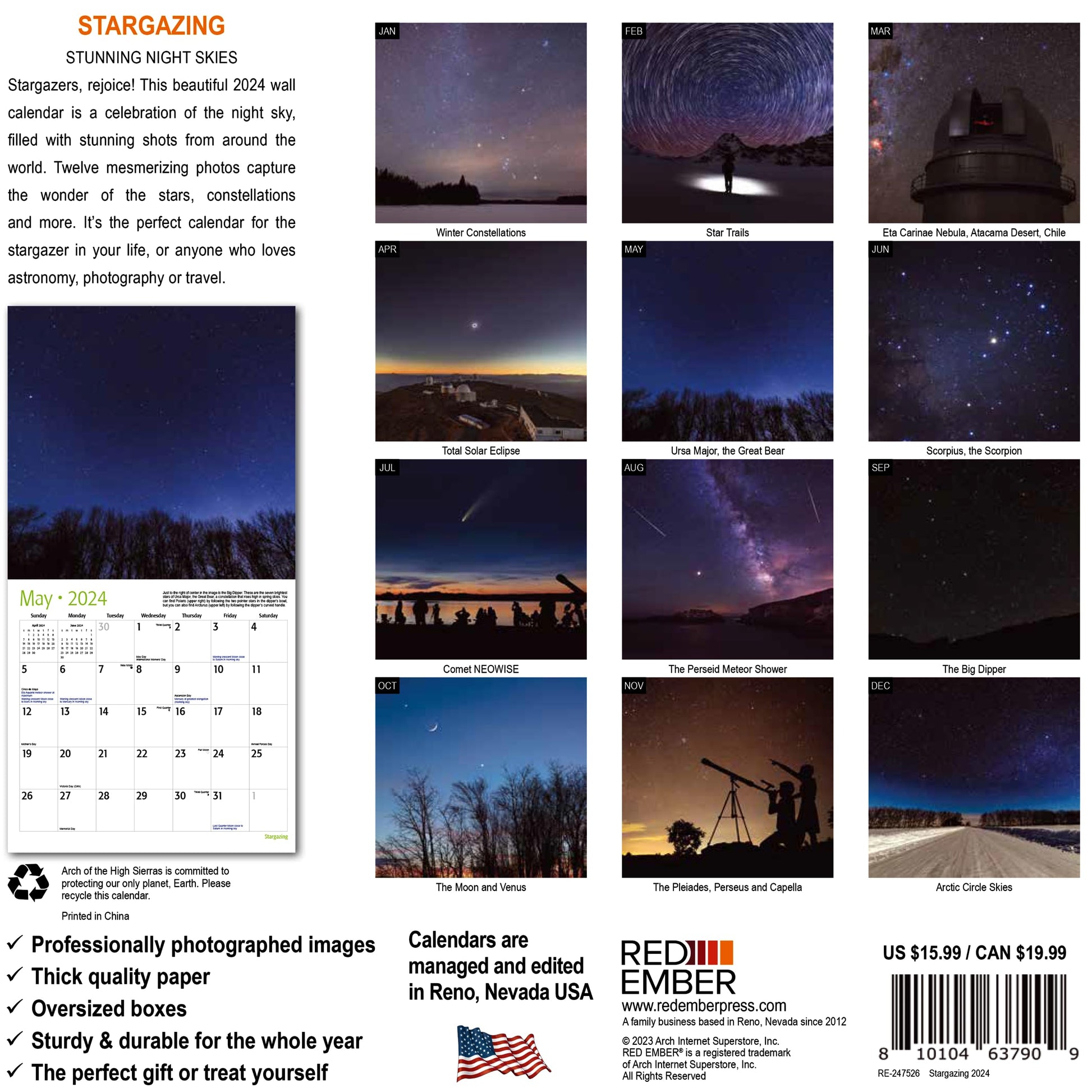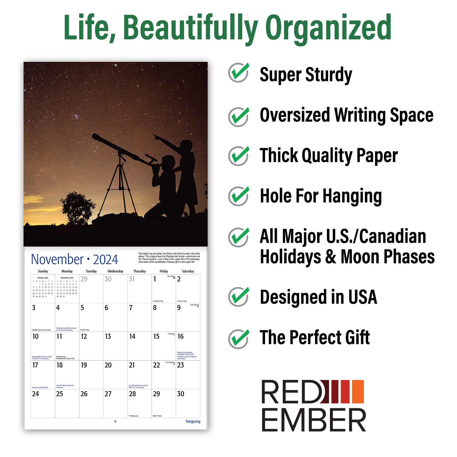 RED EMBER Stargazing Tips Night Sky 2024 Monthly Wall Calendar | 12" x 24"