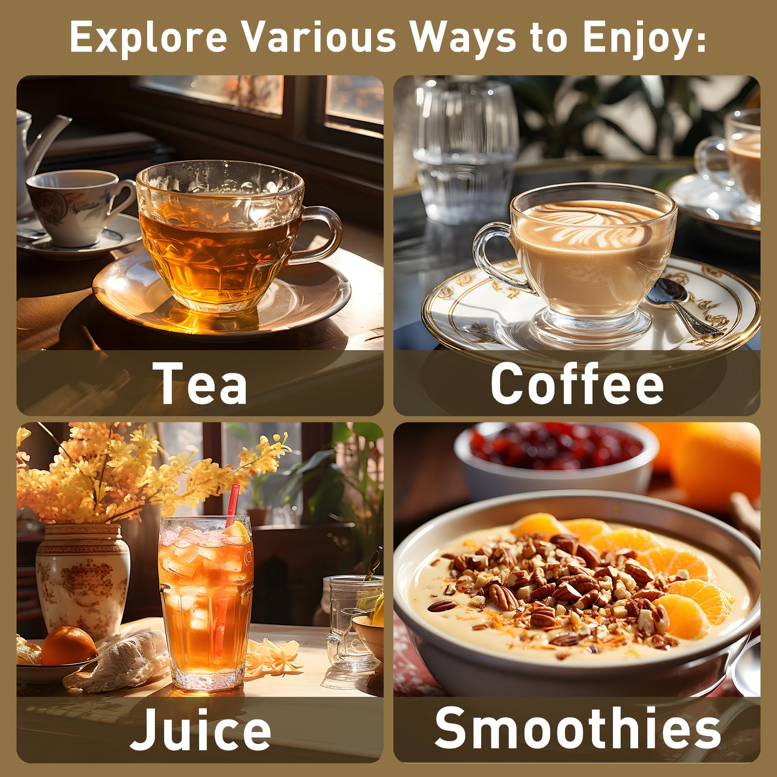 • Complements tea, coffee, shakes, and smoothies